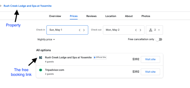 Free booking links launched in March of 2021 in the Google Hotel Search below the paid hotel ads. The section labeled "all options" below the paid listings now shows unpaid listings from hotels & travel companies.