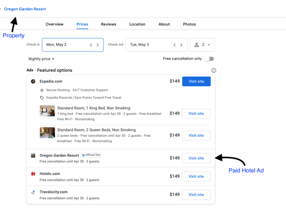 Any hotelier or travel company that wants to leverage this option must opt-in with a provider to open those channels for rates to be shared. They must also set up a campaign with a minimum bid to be shown. Free listings consist of the hotel's name and the room rate for the selected itinerary.